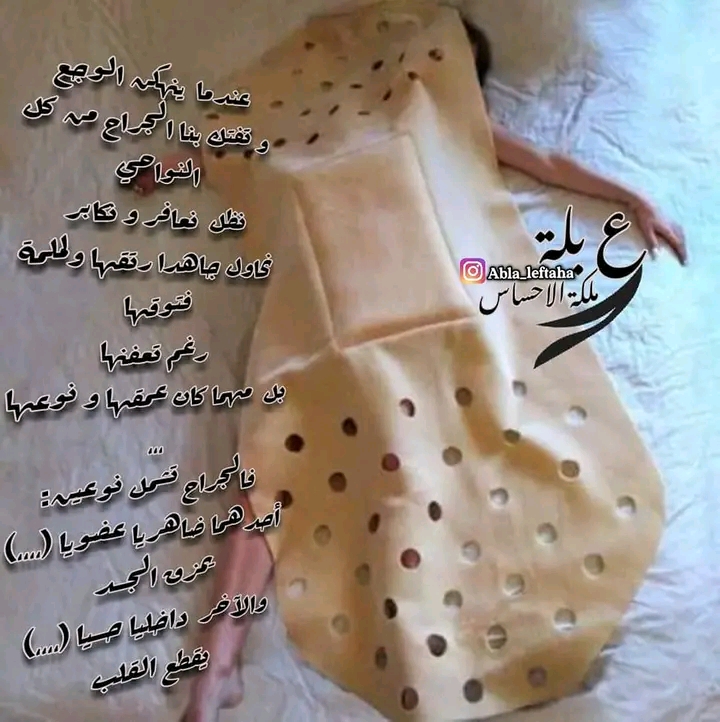 عندما #ينهكنا_الوجعو تفتك بنا الجراح من كل النواحينظل نعافر و نكابرنحاول جاهدًا رتقها ولملمة فتوقهارغم تعفنهابل مهما كان عمقها و نوعها فالجراح تشمل نوعين: أحدهما ضاهرياً عضوياً (،،،،) يمزق الجسدوالآخر داخلياً حسياً (،،،،) يقطع القلب ،،، الصورةأبلغمنأيتعبير ✓عبلة__ملكة الإحساس
